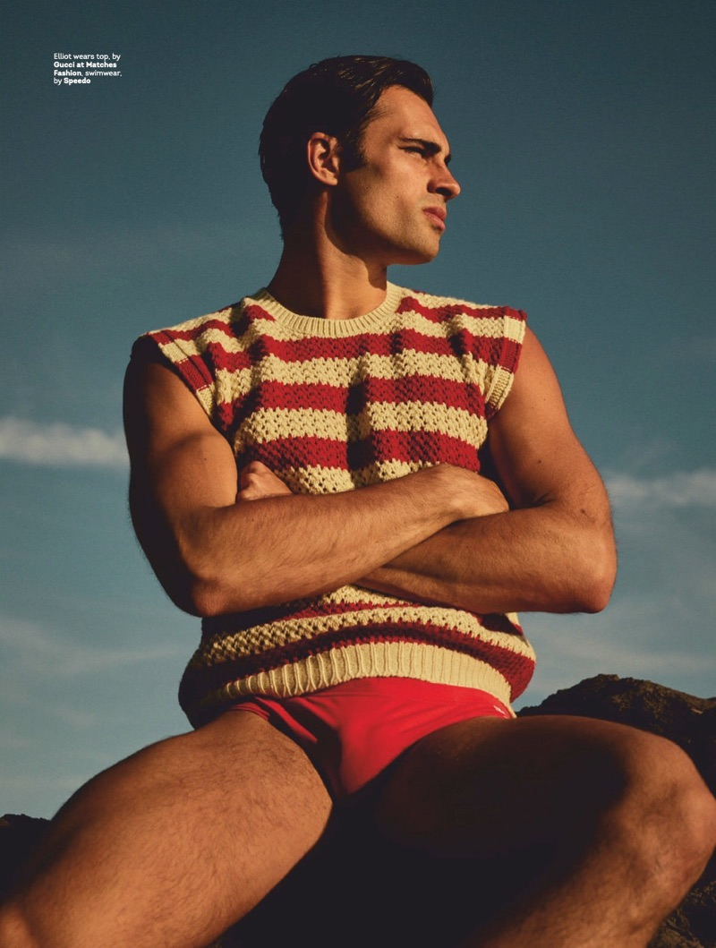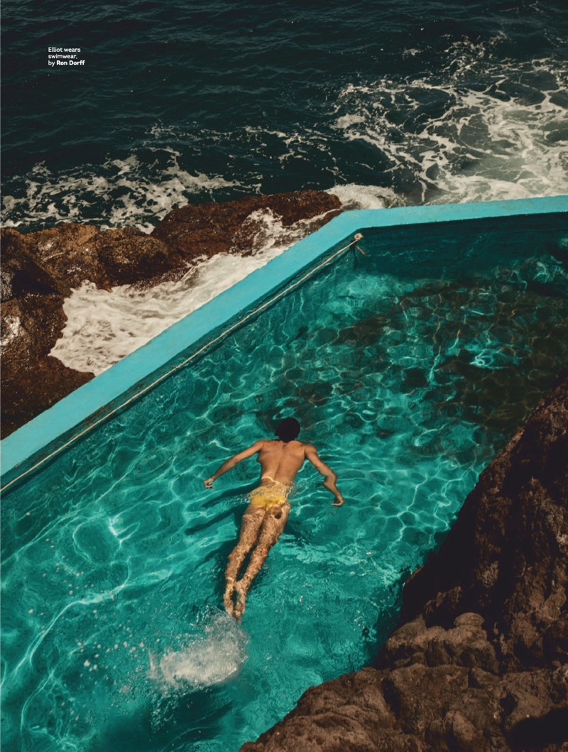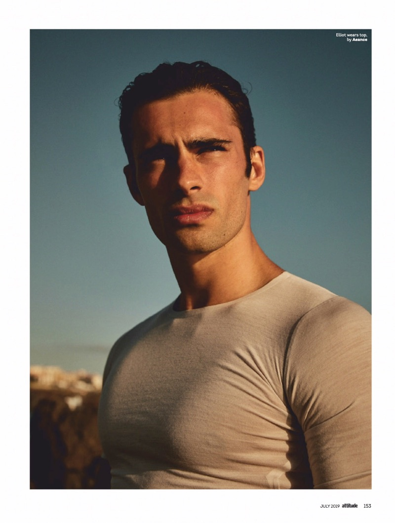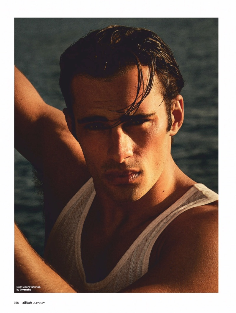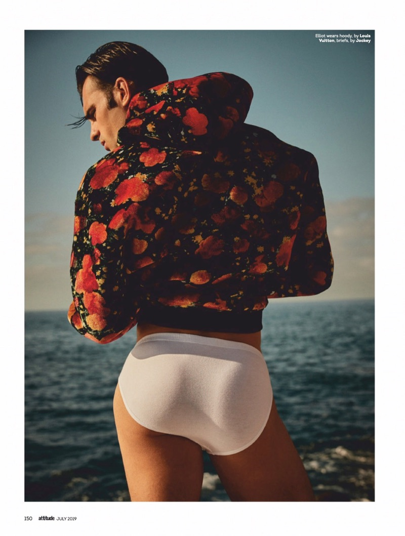 Elliot Meeten travels to Madeira for the July 2019 issue of Attitude. Starring in an editorial entitled “Water Sign,” the British model reunites with the magazine to showcase summer swimwear. Taking to the beach, Elliot appears before the lens of photographer Jenny Brough. Tapping into a season of leisure, Joseph Kocharian styles Elliot in swimwear and underwear. The British model wears brands such as Dsquared2, Ron Dorff, and Aussiebum.” – TheFashionisto.com