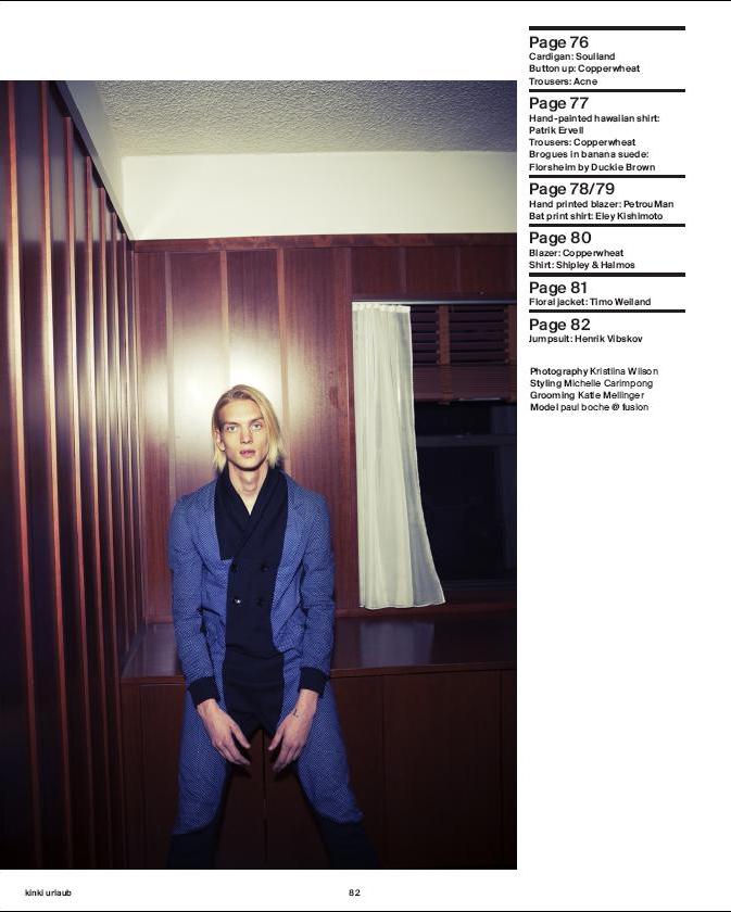 Paul Boche is captured by Kristiina Wilson and styled by Michelle Carimpong for Swiss periodical Kinki and the result is haunting and beautiful. The intensity of Paul’s eyes always sends shivers down our spine. Paul dons beautifully prints from brands like Soulland and Petrou//Man. Katie Mellinger provided the grooming for the shoot. Courtesy of – hommemodel.blogspot.com