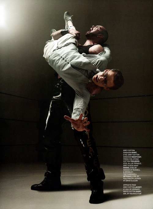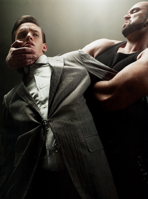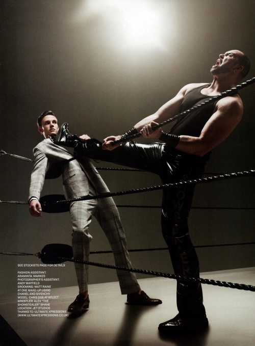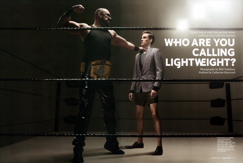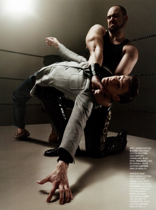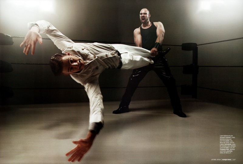 “Model Chris Doe gets a bit manhandled and roughed up on the hands of Alex “The Showstealer” Shane in the June 2010 issue of British Esquire. The playfully violent ‘Who Are You Calling Lightweight?’ is photographed by Phillip Toledano with fashion by Catherine Hayward.”Homotography