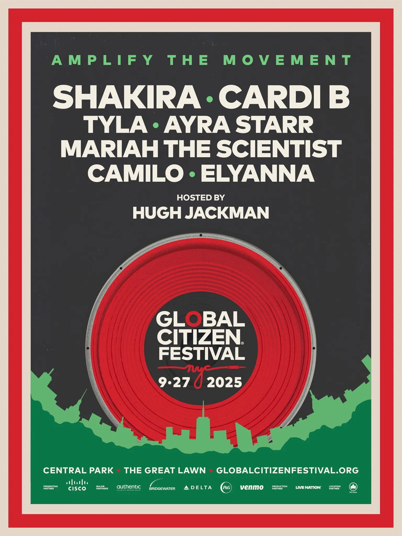 Festival Details: The 2025 Global Citizen Festival is scheduled for Saturday, September 27, on the Great Lawn in New York’s Central Park. Cardi B will join a stacked lineup including Shakira, Tyla, Ayra Starr, Mariah the Scientist, Camilo, and Elyanna. The event will be hosted by Hugh Jackman, with co-hosts like Bill Nye, Adam Lambert, and Danai Gurira joining the cause.