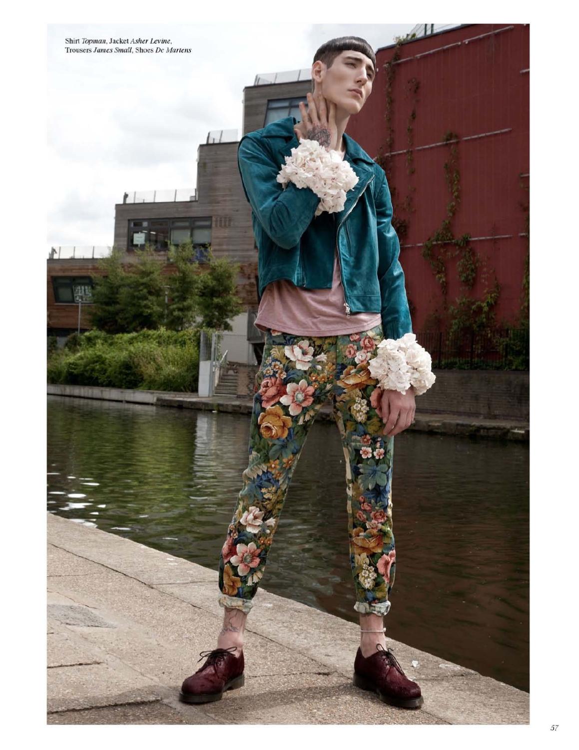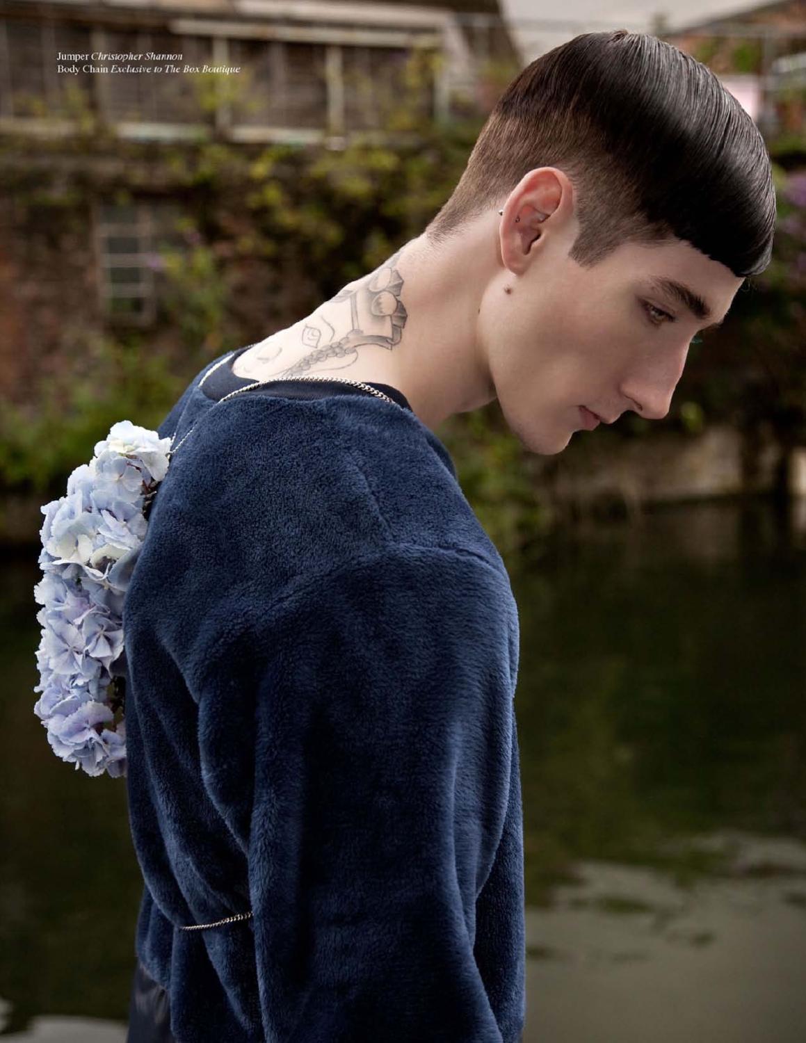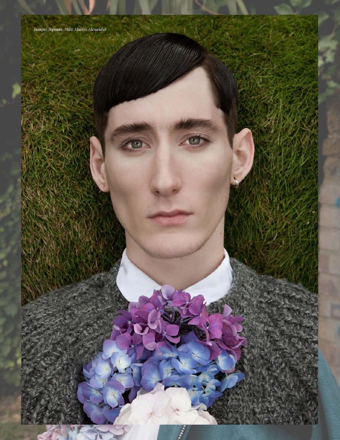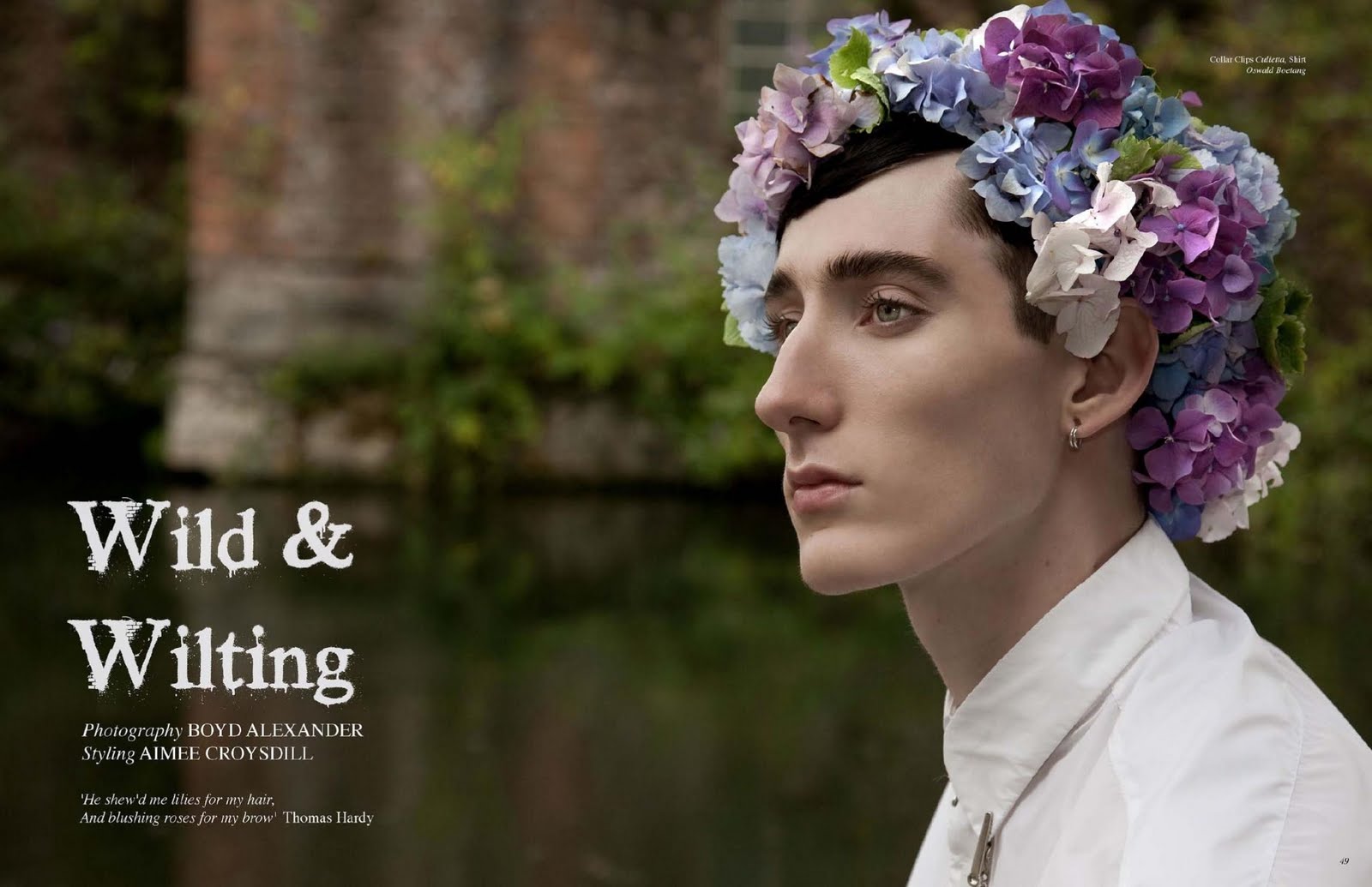 Boyd Alexander and Aimee Croysdill dandify Dan Felton in this stunning shoot for Carbon Copy’s tenth issue. Dan’s rocker look is juxtaposed brilliantly with a litany of floral accessories from a floral headpiece to floral accents on a pair of winkle pickers. Courtesy of – hommemodel.blogspot.com