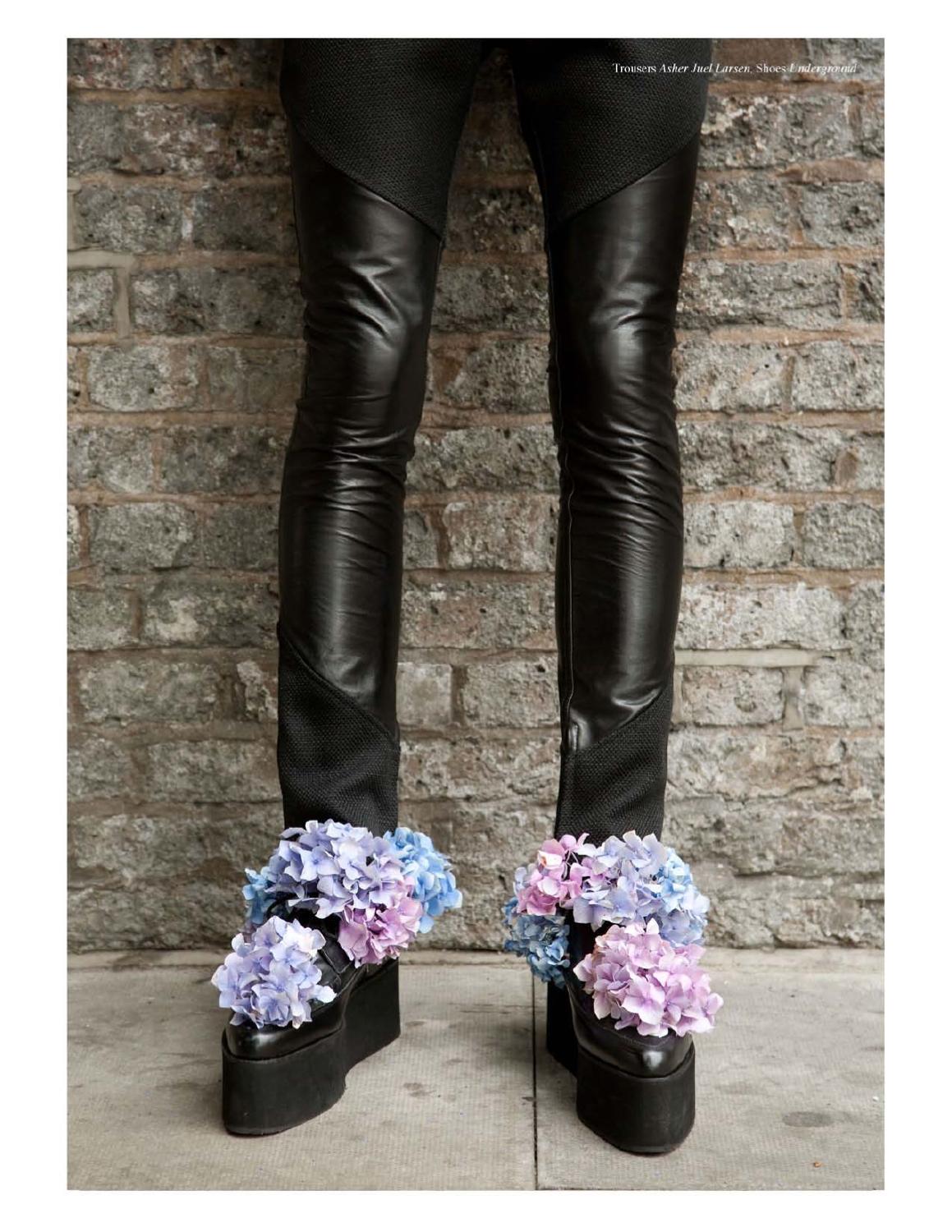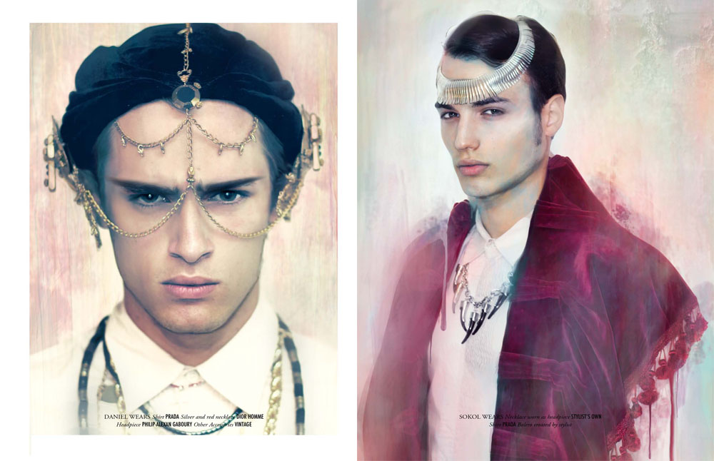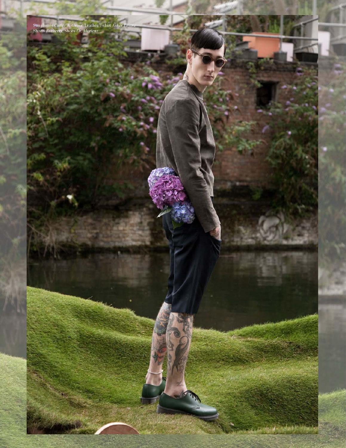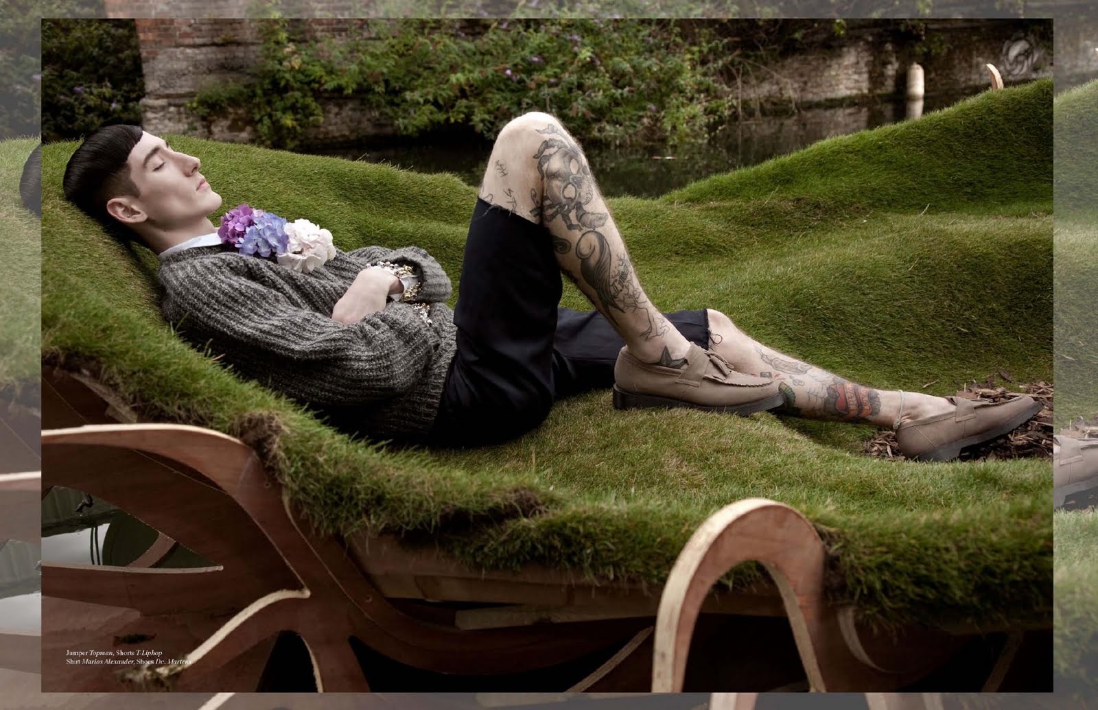 Boyd Alexander and Aimee Croysdill dandify Dan Felton in this stunning shoot for Carbon Copy’s tenth issue. Dan’s rocker look is juxtaposed brilliantly with a litany of floral accessories from a floral headpiece to floral accents on a pair of winkle pickers. Courtesy of – hommemodel.blogspot.com