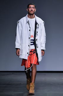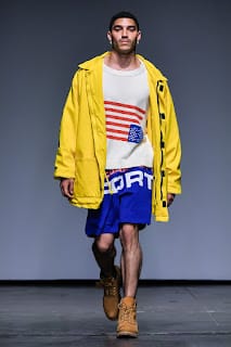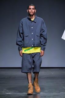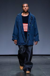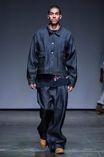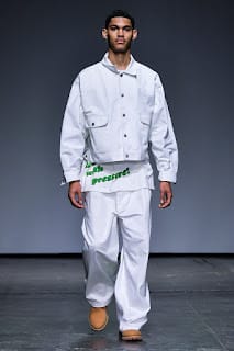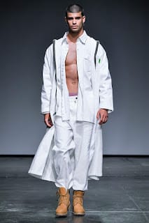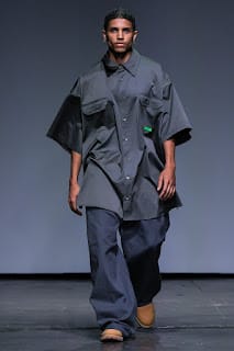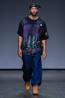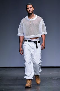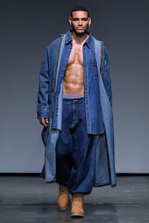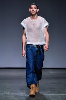 Albeit a hard transition, oversized streetwear enveloped the runway. As we went from the field to 1990. Baggy silhouettes in denim with low hanging pants and Timberland’s machismo’ed their way to the front. Sheer cut off tops sat on torsos and embroidered crosses ornamented backs.