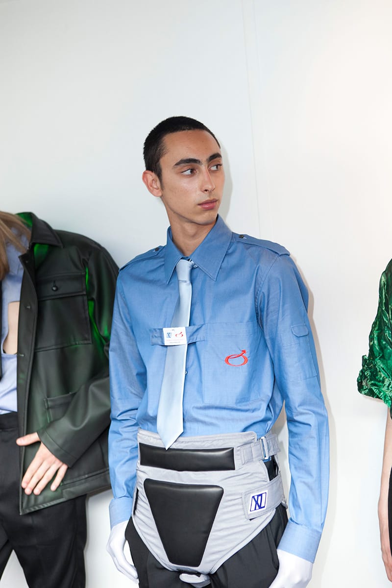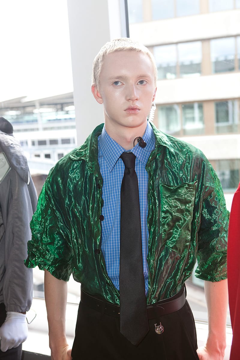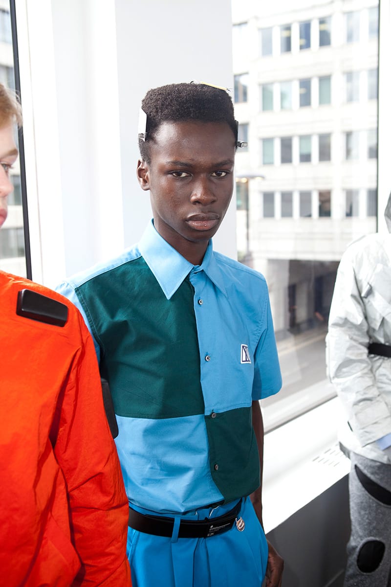 A trip down memory lane as the first outfits begin to show: the black tie and belt combo, a uniform for the slightly above average salary. There are several nods to the boom and bustle of the corporate 90s: shirting etched with embroidered logos, suit bags carried across the back, security ear pieces, boxy short sleeved shirts adorned with a primary colour palette. It is a compilation of all the working types: public sector service boy, high flying financer. They lack presence, they lack humanity; but with this the clothes come into their own. Slowly, we chip away at the dystopian exterior: a few splashes of neon tie dye on a shoe, Radioactive green seeping from a suit jacket seam. What is their story? What time period are these business ready robots really from?