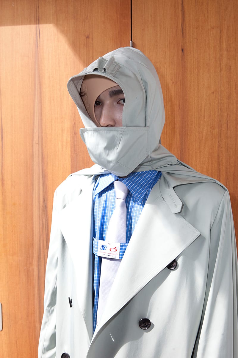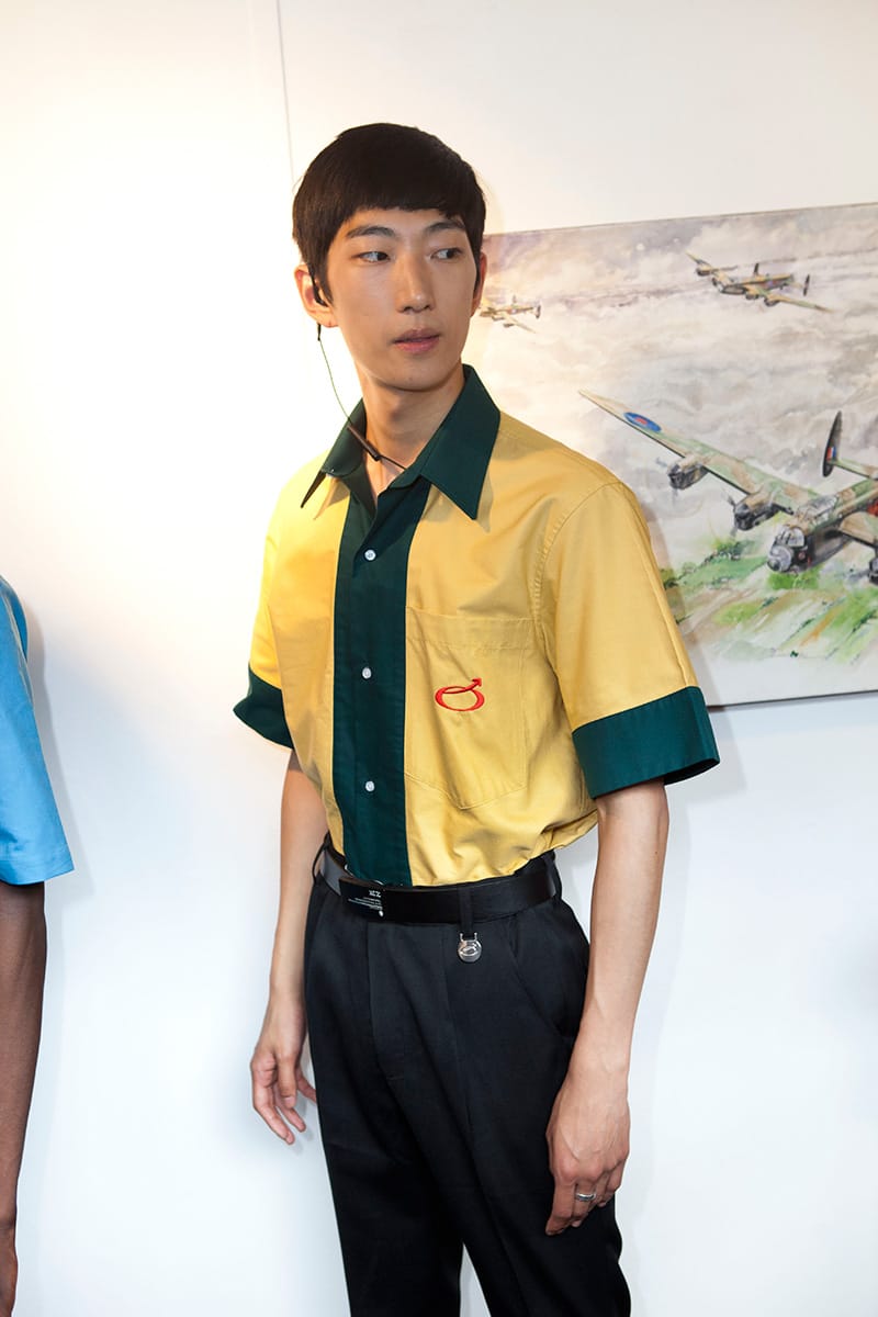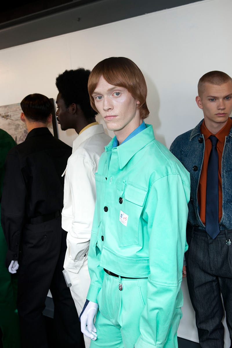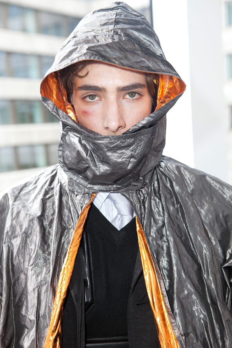A trip down memory lane as the first outfits begin to show: the black tie and belt combo, a uniform for the slightly above average salary. There are several nods to the boom and bustle of the corporate 90s: shirting etched with embroidered logos, suit bags carried across the back, security ear pieces, boxy short sleeved shirts adorned with a primary colour palette. It is a compilation of all the working types: public sector service boy, high flying financer. They lack presence, they lack humanity; but with this the clothes come into their own. Slowly, we chip away at the dystopian exterior: a few splashes of neon tie dye on a shoe, Radioactive green seeping from a suit jacket seam. What is their story? What time period are these business ready robots really from?