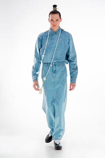 Concepts of ancient Chinese divinities, distinguishable by the tenderly burning lamps, indicated the next phase of the ceremony. Forming a collage of archaic elements, the garments worn by the onscreen gurus combined the customary with the sci-f, bringing about a pact between past and present cultures. Skirts and tunics, inspired by the universal liturgical dress, are further-decked with funnel-necked racers, outsized V-neck knits, and hanfu shirts. Pieces come as embellished with strings of beads, rounded up by naïve cartoon graphics and textual surface patterns.