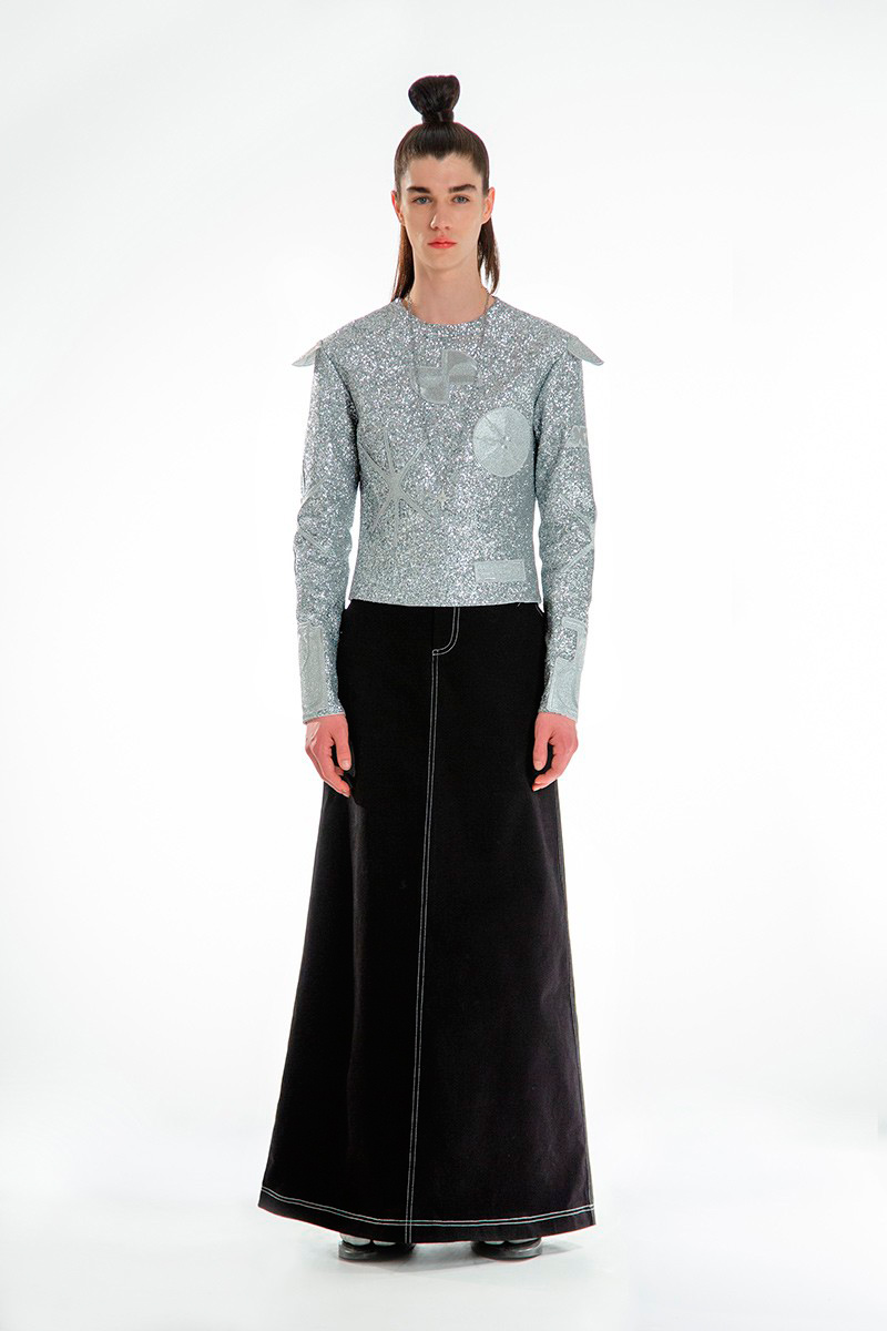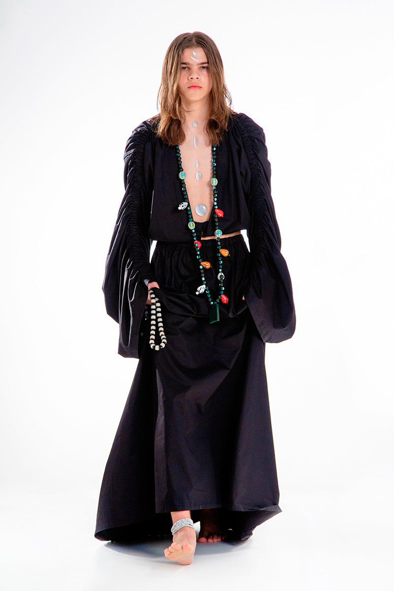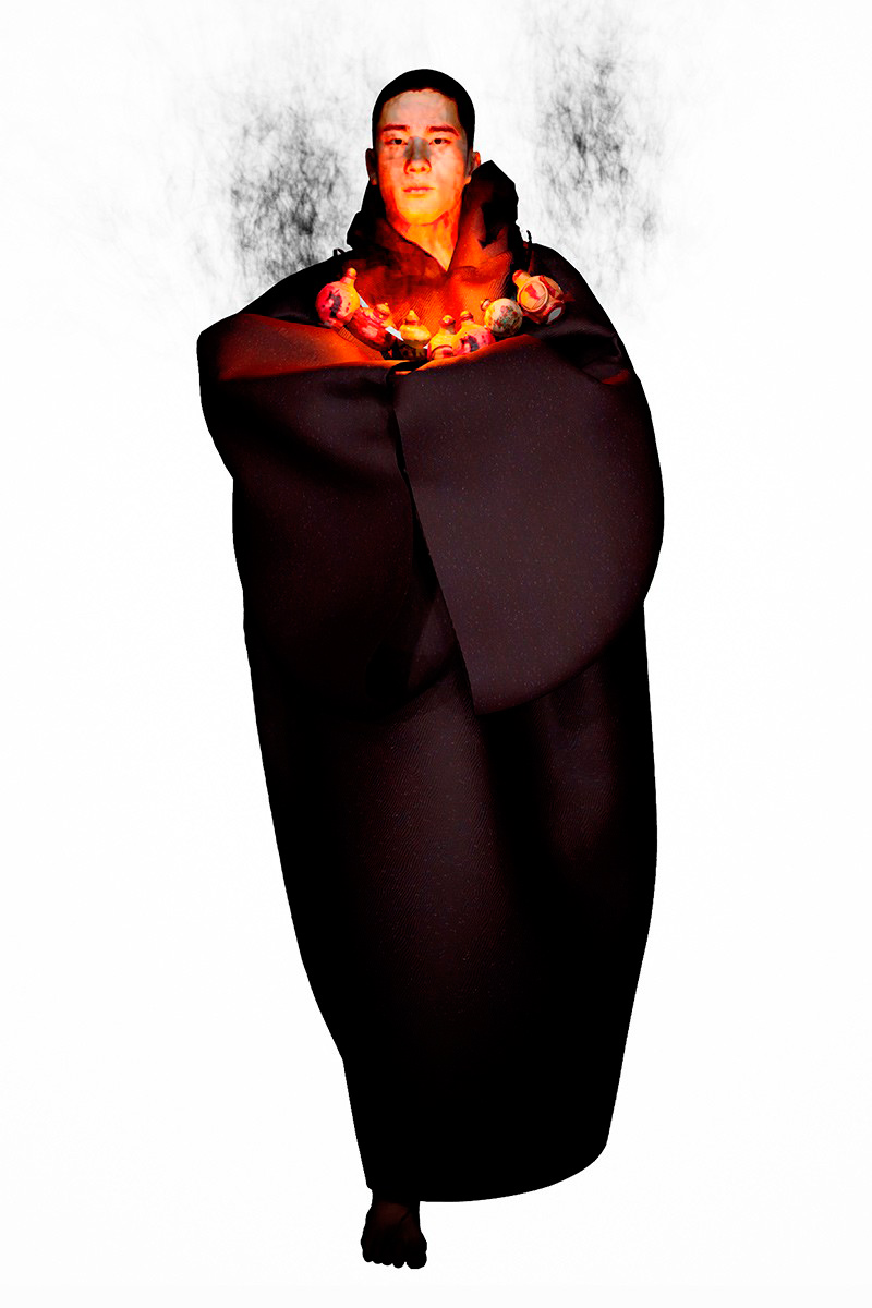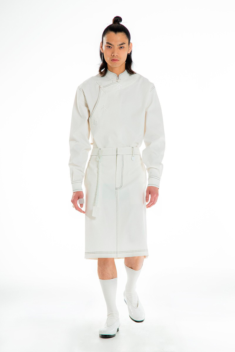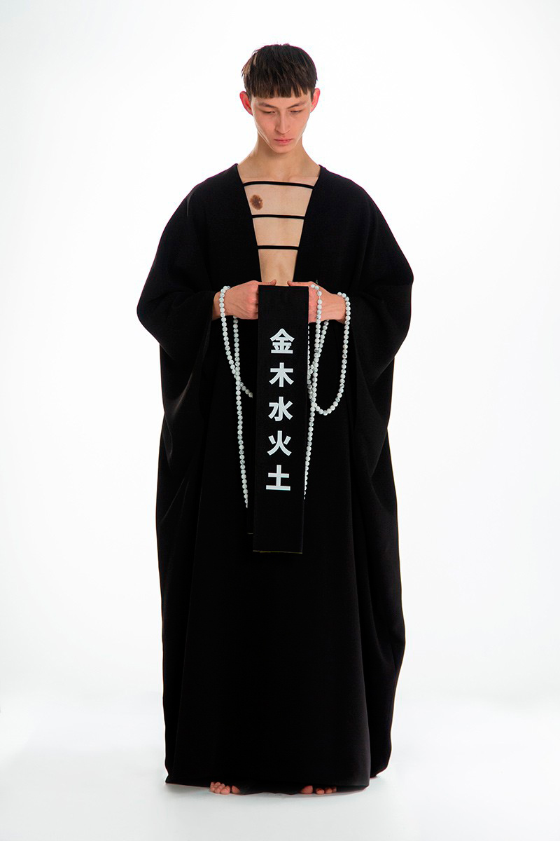 Concepts of ancient Chinese divinities, distinguishable by the tenderly burning lamps, indicated the next phase of the ceremony. Forming a collage of archaic elements, the garments worn by the onscreen gurus combined the customary with the sci-f, bringing about a pact between past and present cultures. Skirts and tunics, inspired by the universal liturgical dress, are further-decked with funnel-necked racers, outsized V-neck knits, and hanfu shirts. Pieces come as embellished with strings of beads, rounded up by naïve cartoon graphics and textual surface patterns.