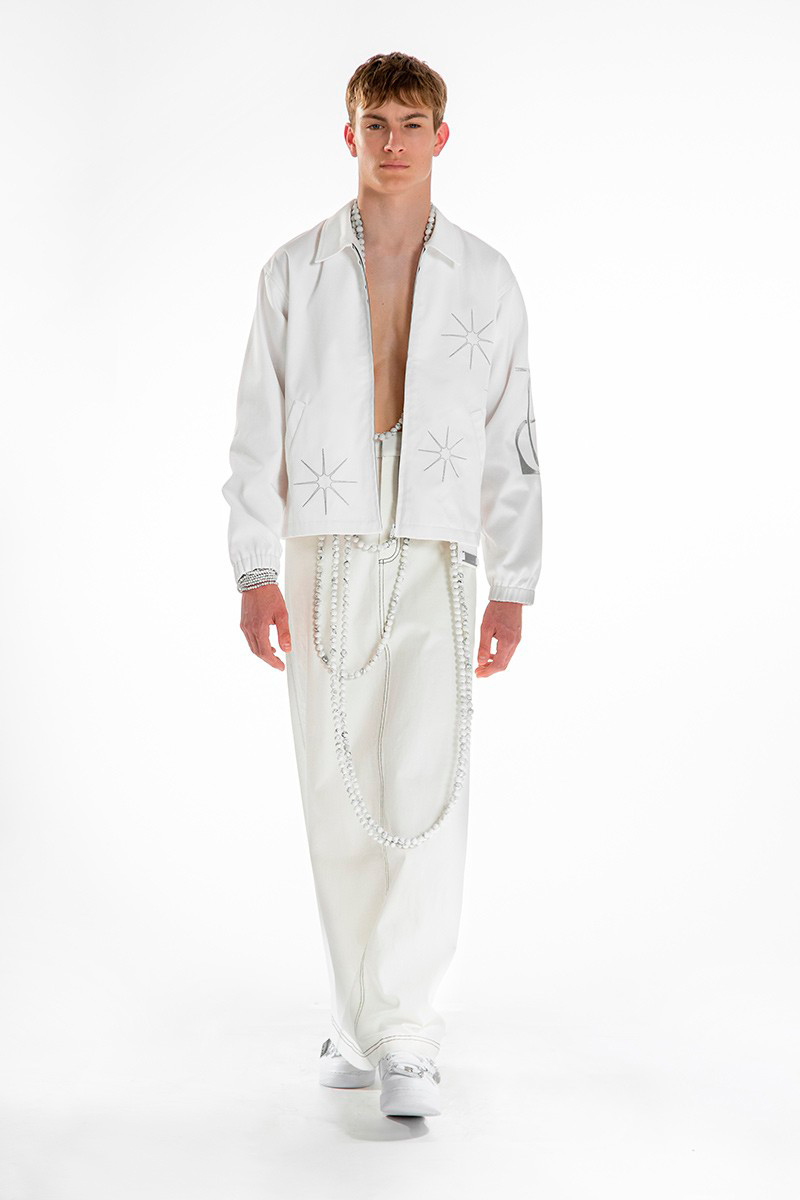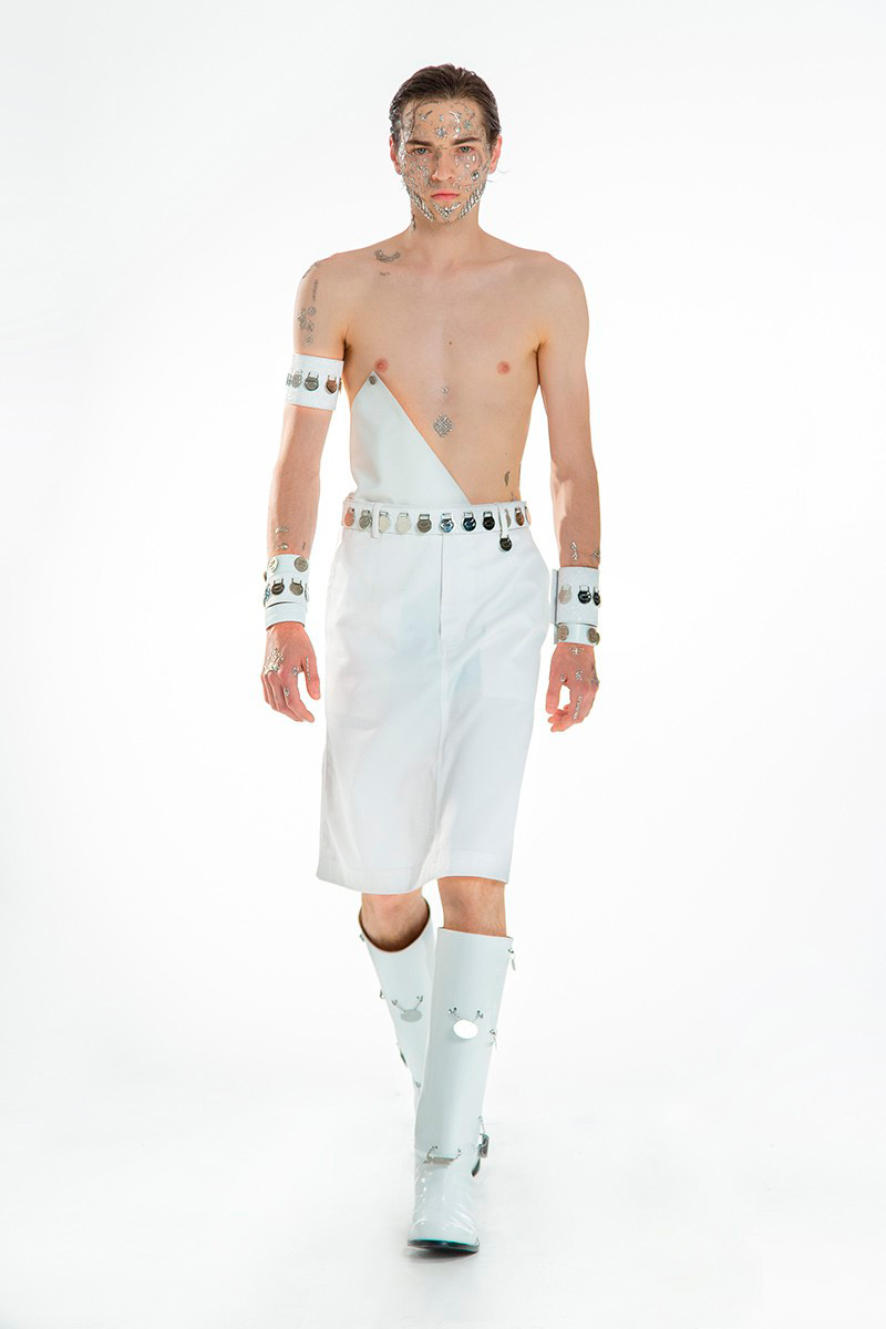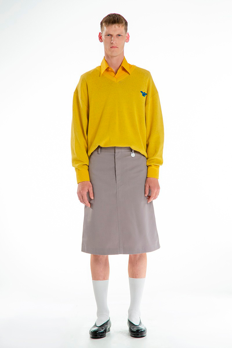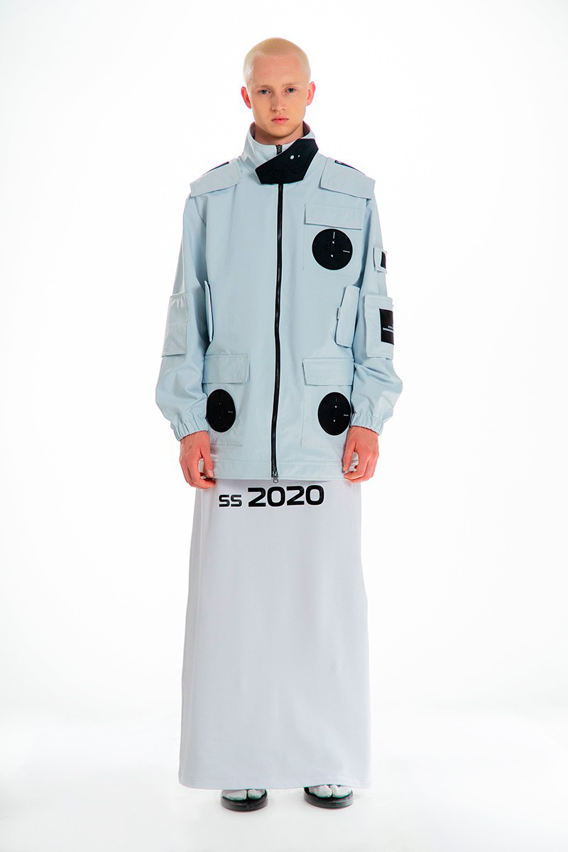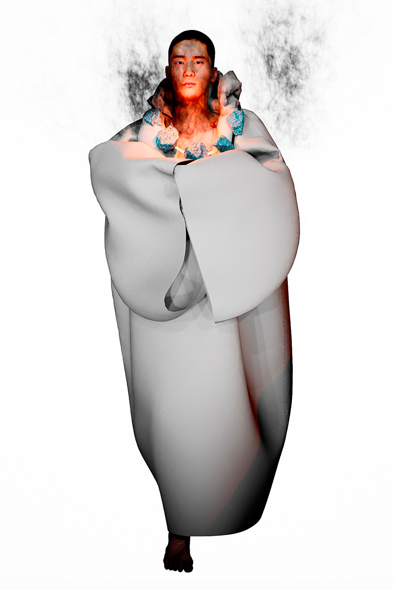 Concepts of ancient Chinese divinities, distinguishable by the tenderly burning lamps, indicated the next phase of the ceremony. Forming a collage of archaic elements, the garments worn by the onscreen gurus combined the customary with the sci-f, bringing about a pact between past and present cultures. Skirts and tunics, inspired by the universal liturgical dress, are further-decked with funnel-necked racers, outsized V-neck knits, and hanfu shirts. Pieces come as embellished with strings of beads, rounded up by naïve cartoon graphics and textual surface patterns.