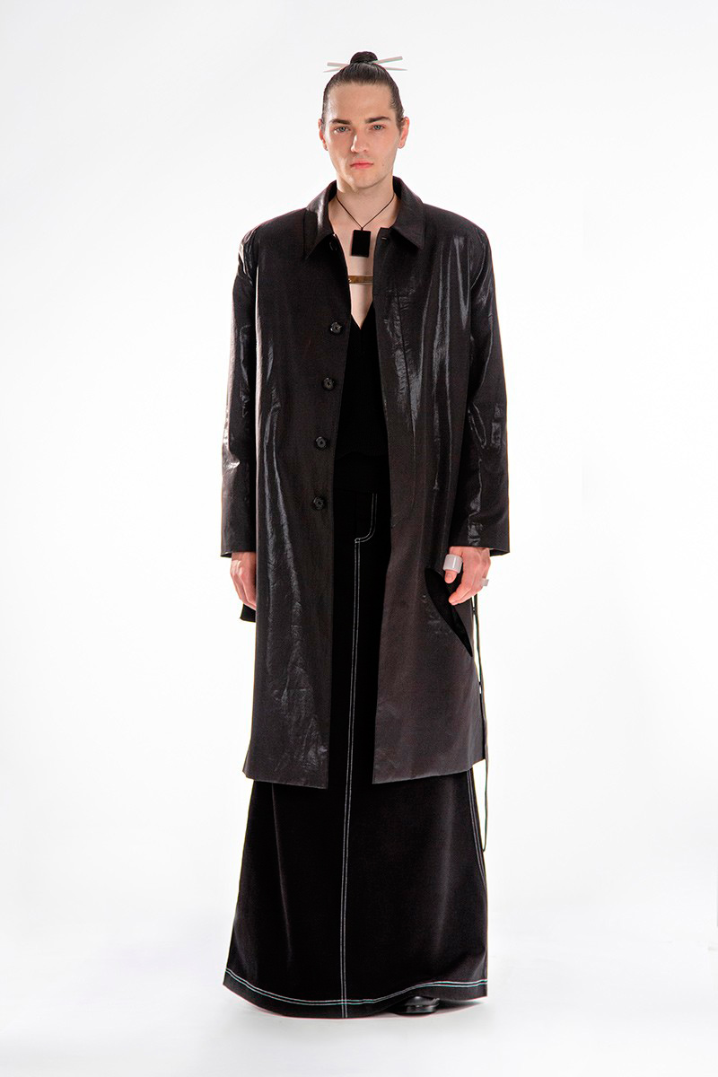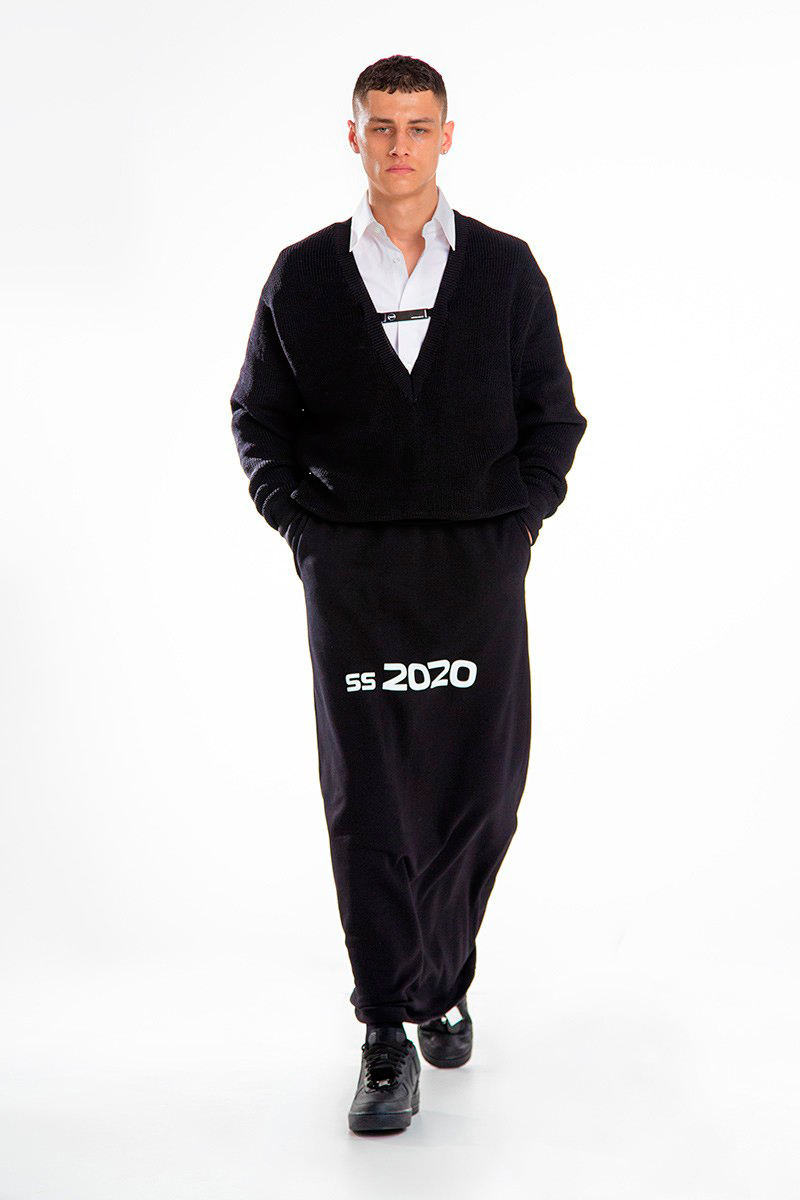 “Chinese-born designer Xander Zhou invites you to detach from the ephemeral. According to his SS20 collection, Zhou throws in a reminder to society, a victim of the world’s ruthless collective voracity. As the collection stormed upon a colossal digital screen, press members were sat right opposite, able to admire the e-catwalk from a near distance. The crowd was welcomed with a nylon branded skirt, while incense burned in the back alongside a placid sound that filled the whole room. The verdict? It did make a statement.