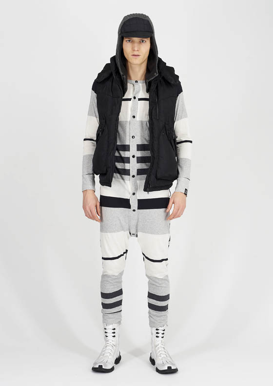 Only a few of you will get this right away, but the collection is more Mario, less Shinobi (both Japanese video game characters, one plain and Americanized, the other ninjafied). Yamamoto’s skill is that he brings the technology and experimental wonderment of Japan’s consumerist obsession to a remarkably toned down German brand that, at the end of the day, is about a plain tennis show with three plain stripes. But the marriage works beautifully, and has so for a decade. Where they’ve lost me before is when I haven’t been able to relate on casual level to Yamamoto’s choices: his pants have been to architectural; there were too many zippers here, folds there, etc. It wasn’t even that there were too many bells and whistles, it’s that the clothing was in its entirety, and exploration of bells and whistles themselves.