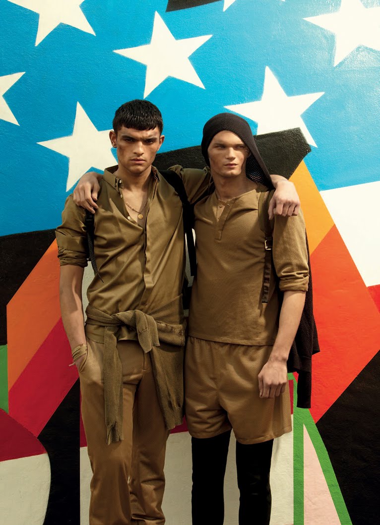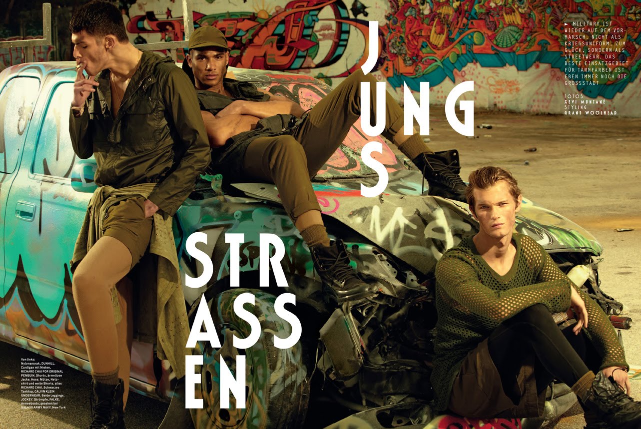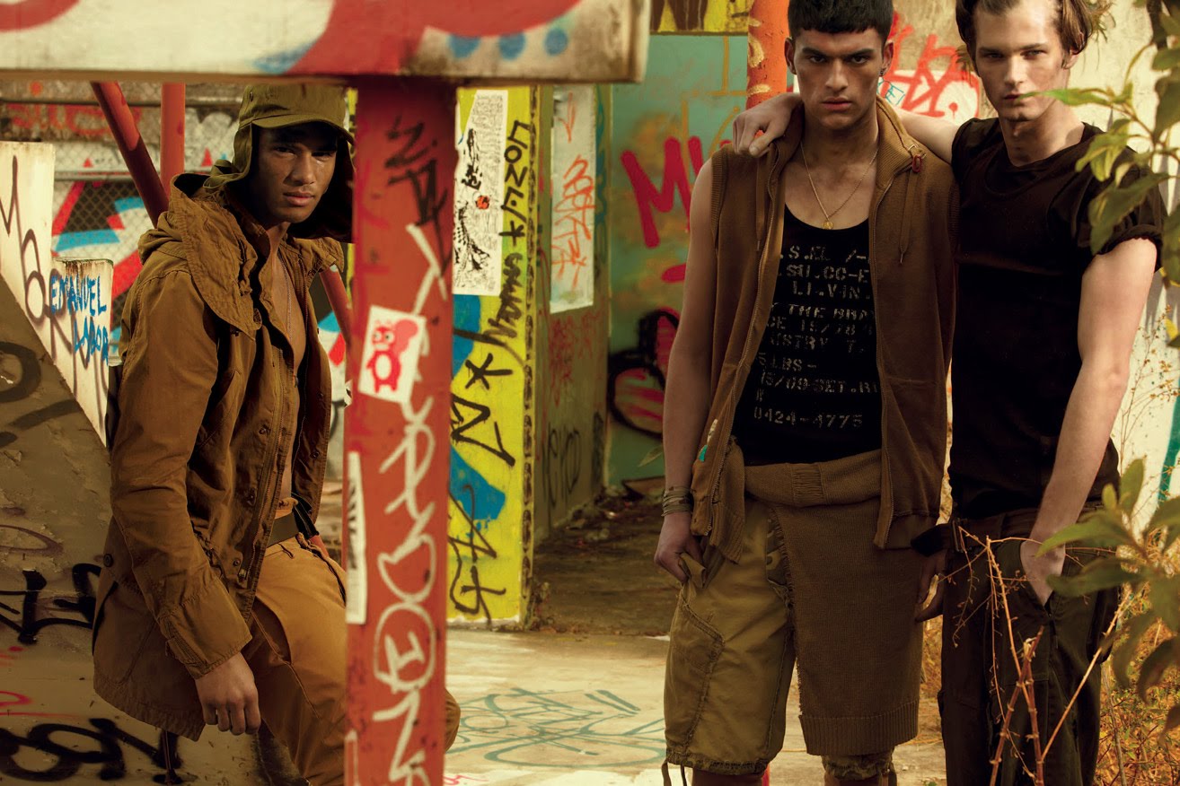 Xevi Muntane and Grant Woolhead take on military looks for GQ Style Germany’s latest issue, featuring Nate Gill, Roy Pratt and Daniel McSweeney in grungy looks in shades of brown and military green. Courtesy of – hommemodel.blogspot.com