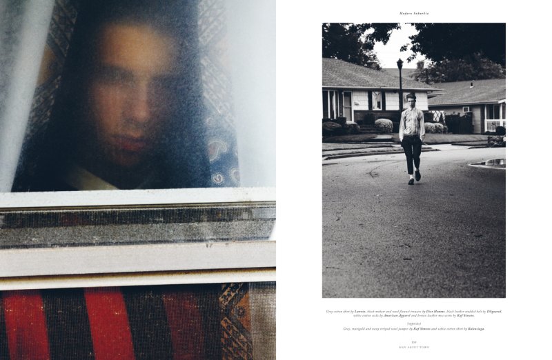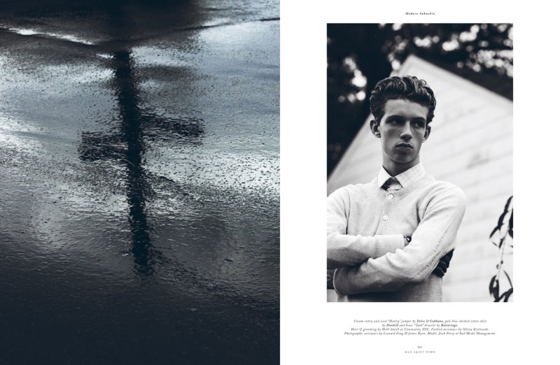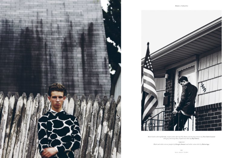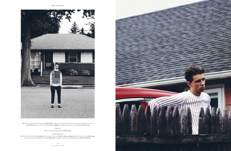 Red model Zach King makes big strides in an editorial for the new issue of Man About Town. Photographed by Kacper Kasprzyk, the young model stars in Modern Suburbia. Plagued with little to no happenings, Zach gets a burst of excitement courtesy of a wardrobe styled by Jay Massacret. Playing off an Americana motif, the spread enjoys a bolt of energy with lively pieces from Giorgio Armani, Mishka and other labels. – Courtesy of Thefashionisto.com